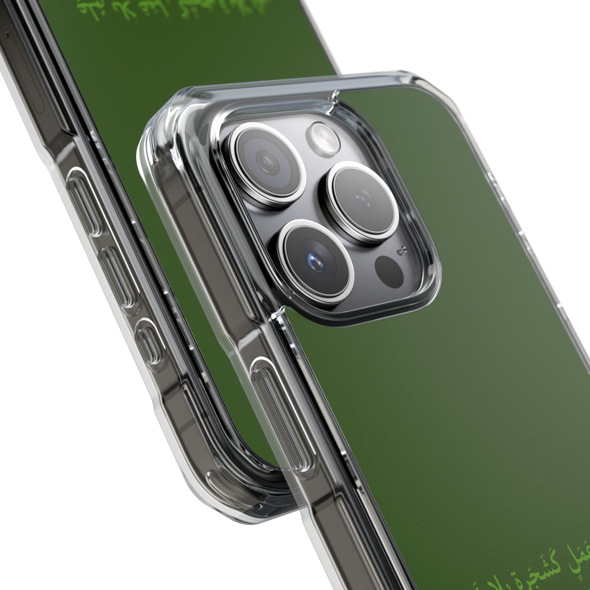 This clear magnetic phone case blends minimalist style with robust protection. The transparent polycarbonate back keeps your phone visible while showcasing a clean, deep-green panel and subtle script detail. A built-in MagSafe-compatible magnet module snaps to chargers and accessories smoothly. TPU sides with air-cushioned bumper corners absorb shocks, and precise cutouts let you add straps or charms. Bright, lasting print quality keeps the color vivid without overpowering the phone’s natural look — an understated shield that lives on your pocketed, daily-ride, or hands-free moments.